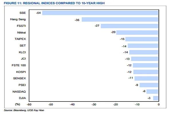 The Straits Times Index (STI) has been a serial underperformer compared to other benchmark indices in the region. This chart from UOB Kay Hian shows that the FSSTI has fallen 27% from its 10-year peak, compared with its ASEAN peers' 9-14% decline from their decade highs.