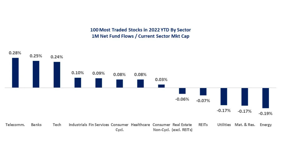 Telecommunications is followed by the banks and technology sector whilst the Energy, Materials & Resources, and Utilities Sectors had the most proportionate net fund outflows.