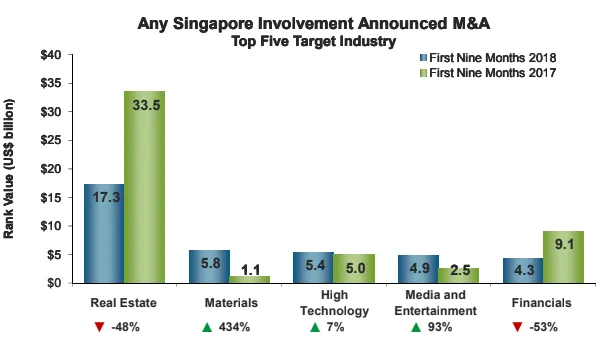 Completed M&A deals involving Singapore amounted to US$50.4b so far this year, a 13.1% decline in value compared to the first nine months of 2017 (US$58b). The Real Estate sector took the lead and accounted for 32% of the market share worth US$17.3b, down 48.3% in terms of deal value, from the first nine months of 2017.