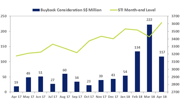 On a yearly basis, however, the $116.8m in consideration was up significantly from the $19m in 2017. "Late April coincides with the beginning of March quarter earnings season in addition to annual general meetings (AGM) for FYs ending 31 December, where 12-month buybacks were scheduled to be approved," SGX said.