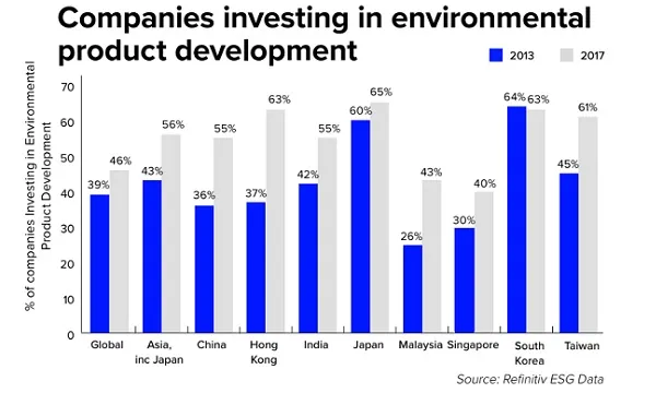 Singapore showed the biggest jump in companies with supply chain policies in the region by 40% over five years to 55% in FY2017. However, it lagged in developing environmentally conscious products, with only 40% doing so compared to 56% of companies in Asia.