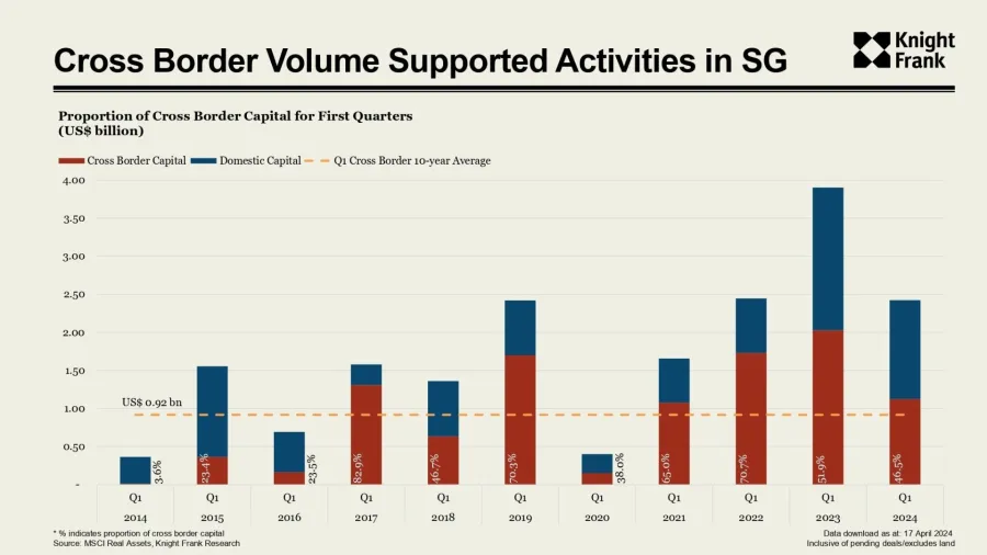 Knight Frank data revealed that overseas investments constituted 45.6% of Singapore's total capital in 1Q24.
