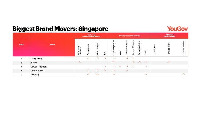 In its Biggest Brand Movers report, YouGov ranks businesses on 13 metrics. Sheng Siong made gains in six metrics, namely "Ad Awareness," "Word of Mouth (WOM) Exposure," "Buzz," "General Impression," "Corporate Reputation," and "Customer Satisfaction."