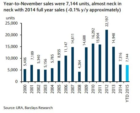 November developer sales rose 39% m/m and 79% y/y to 759 units, bringing 11M15 sales to 7,144 units (-0.1% y/y). While Barclays expects a quiet December, believes sales for full year 2015 could slightly exceed 2014’s full year sales of 7,316 units.