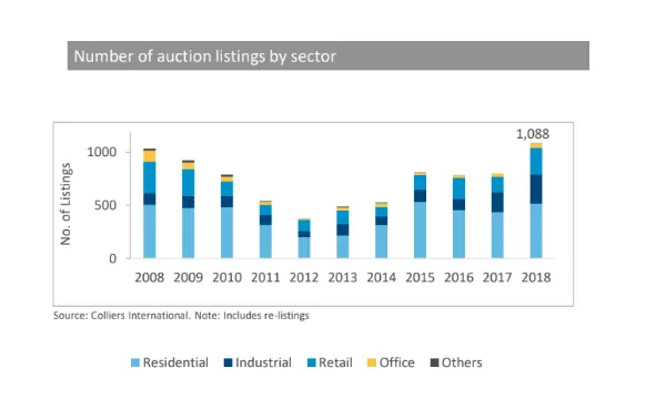 Total auction listings jumped 35% YoY to 1,088 (including re-listings), according to Colliers International. For H2 2018, properties put up for auction climbed 40% HoH and 47% YoY to 634 listings.