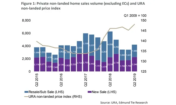 Private non-landed property sales volume hit 4,212 units in Q2, the highest since cooling measures were introduced in Q3 2018, according to a report by Edmund Tie.