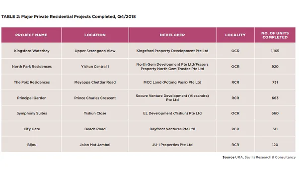 A number of big projects received their Temporary Occupation Permits (TOPs) in Q4 including Kingsford Waterbay (1,165 units), North Park Residences (920 units), The Poiz Residences (731 units), Principal Garden (663 units) and Symphony Suites (660 units). A TOP means that homeowners can temporarily occupy a building.