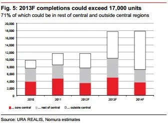 With the completion of over 2,000 units now deferred to 2013F (lifting the projected completions in 2013F from 15,155 units previously to 17,758 units) we see higher vacancy risk in 2013F.