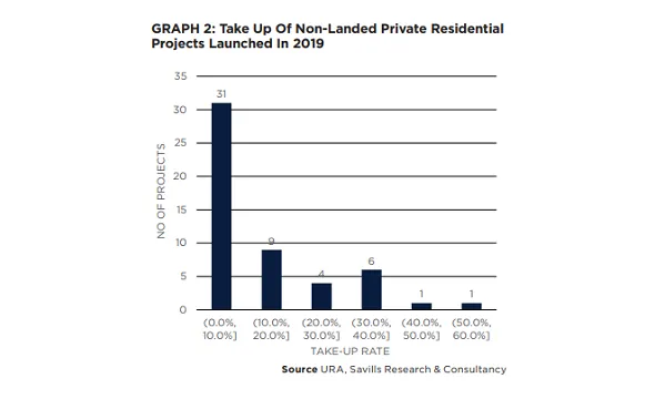 This chart from Savills shows that the take-up rates of condo projects in 2019 has been low in the four weeks since the sale day of first caveat.