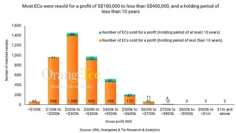 This chart from OrangeTee shows how much executive condominiums (ECs) were resold, with most profits between $200k to $300k.