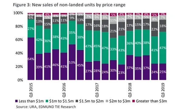 This chart from Edmund Tie & Co. reveals that almost half of new condo units sold in the third quarter, or 47% of total units sold were priced between $1m to $1.5m as a result of the increase of proportion of smaller units being sold.