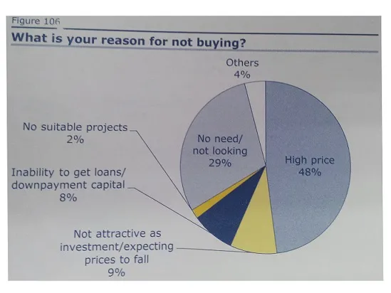 According to CLSA, 48% of respondents are not buying property because of high prices, while 29% are simply not looking for new properties.