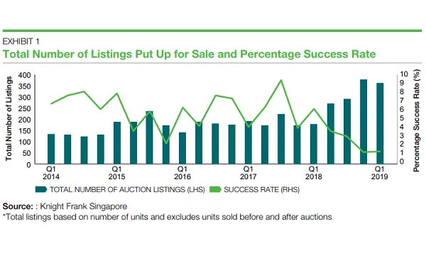 The five properties sold under the hammer in Q1 2019 translated to a total gross sales value of $11.6m. Whilst the number of properties successfully auctioned remained the same on a quarterly basis, the gross sales value increased 120.8% QoQ after the successful auction of a unit at Grange Residence for $7.2m.