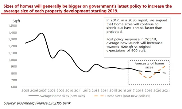 This chart from DBS Bank reveals that the government’s policy to hike the average size of home projects will drive home size to rise to 920 sqft in 2021. The policy is in response to a decline in home sizes, which dropped towards the level of 700 sqft in 2018-2019.