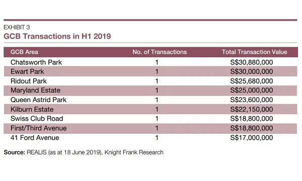 This chart from Knight Frank shows the nine good class bungalows (GCB) that traded hands during the first half of the year, with a total transaction price of $211m.