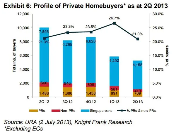 According to Knight Frank, based on caveats lodged data available as at 2 July 2013, the proportion of foreign homebuyers, including Permanent Residents (PRs) and non-PRs (NPR), decreased to 21.0 per cent in 2Q 2013, which is lower than 26.7 per cent in 1Q 2013 and the average proportion of 22.2 per cent in 2012.