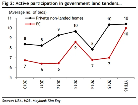 According to a report by Maybank Kim Eng, average bids for private non-landed homes stayed at 10, while bids for executive condominium sites rose from 7 to 10 this year so far.