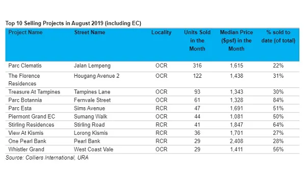 Parc Clematis, the best-selling private residential project in August, sold 316 units at a median price of $1,615 psf. This was followed by the Florence Residences, which shifted 122 units at a median price of $1,438 psf; Parc Botannia, which moved 61 units at a median price of $1,328 psf; and Parc Esta with 47 units transacted at a median price of $1,691 psf.