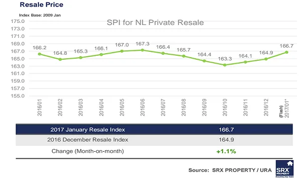 Non-landed private residential resale prices are on the uptrend in January, up by 1.1% compared to December 2016. For the past year, prices peaked in June and went downhill until October.