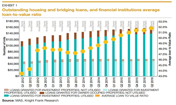 According to data from MAS and KnightFrank, average property LTV ratio reached 51.7% as at mid-2016, gradually escalating from the previous low of 47.2% in Q4 2013.