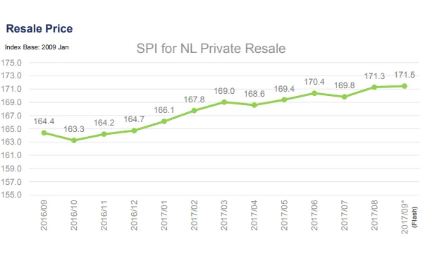 This chart from the Singapore Real Exchange (SRX) shows the resale price index for private condominiums and apartments rose to 171.5 in September.