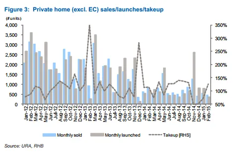According to a report by RHB, developers launched only 357 units with no new EC units in Feb 15, down 15.2% MoM and 48.3% YoY. This was way below the 2014 average of 644 units (excl. ECs) and 2013 average of 1,399 units. Developers may also be reluctant to launch new projects during the Chinese New Year season, as sales slowed.