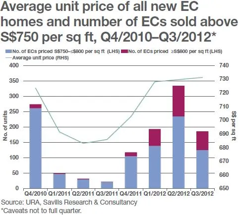 The number of ECs priced at S$800 per sq ft and above has also jumped significantly to 215 units in the first three quarters of this year, from 19 units in 2011 and 13 units in 2010. Similarly, those priced between S$750 per sq ft and S$800 per sq ft doubled from 261 units in 2010 and 204 units in 2011, to 499 units in the first three quarters of this year. The average unit price of all new ECs reached an historical high of S$731 per sq ft in Q3 this year.