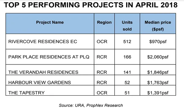 Rivercove Residents, an EC development in OCR, was the best performing proejct in April after selling 512 units at a median price of $970 psf, contributing 86% to total EC sales.