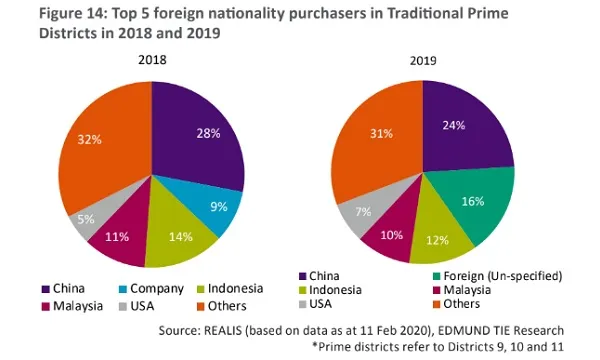 This chart from EDMUND TIE reveals that the share of condos in traditional prime districts sold to mainland Chinese homebuyers declined to 24% in 2019, compared to 28% in 2019. Still, they remained the top buyers of condos in the region.