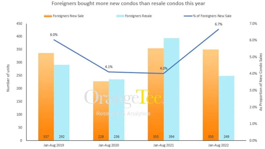 This chart from OrangeTee shows the number of new condos versus resale condos bought by foreigners from 2019 to 2022.