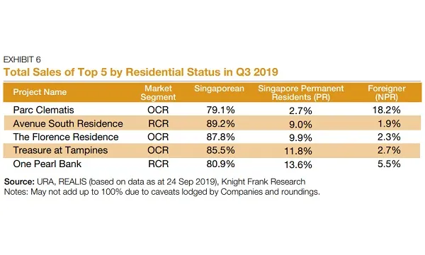 Singaporean buyers still accounted for most of the new home purchases in the top five projects by sales, ranging from 80%-90% of the units purchased. Knight Frank noted that these projects appealed to Singaporeans seeking to purchase for occupation because of the location, the potential upside due to government development plans, and the affordable quantum.