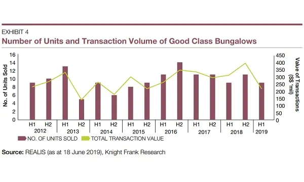 This chart from Knight Frank showed that the l sales of good class bungalows (GCB) plunged 45.3% in the first six months of 2019.