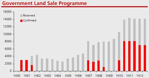 The government has announced it will offer 15 confirmed list and 24 reserve list sites for sale in 2H12. These sites can yield a total 14,200 residential units (including 3,100 ECs), 388,000sm GFA of commercial space and 3,700 hotel rooms. Of this, 14 land parcels are new.