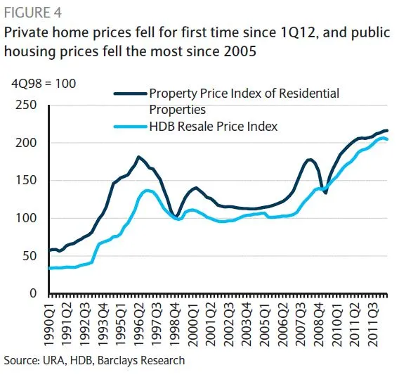 According to Barclays, private home prices have posted the first drop in seven quarters – the 4Q13 URA private home price index fell 0.8% q/q, bringing the full-year 2013 to a slight increase of +1.2%, which compares to increases of 2.8%/5.9%/17.6% in full-year 2012/2011/2010.