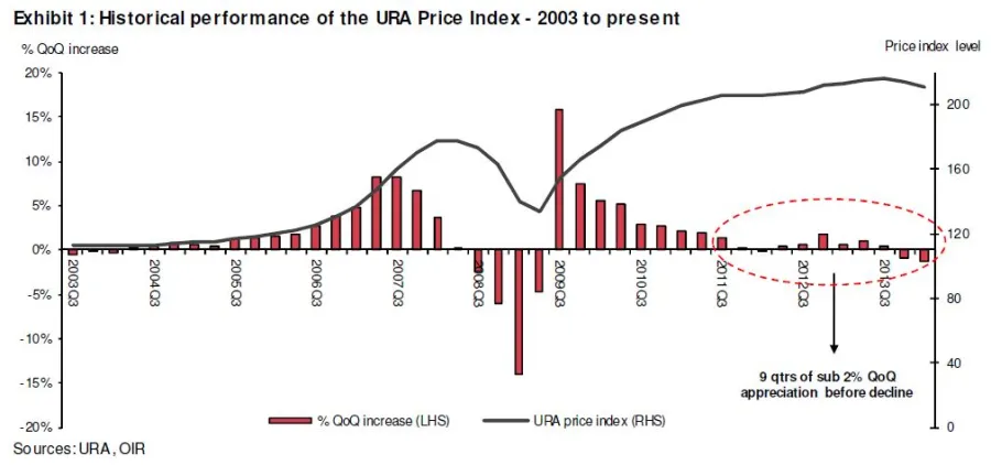 According to OCBC, they saw the URA residential price index fall 1.3% and 0.9% in 1Q14 and 4Q13, respectively, after nine quarters of sub-2% appreciation before that.