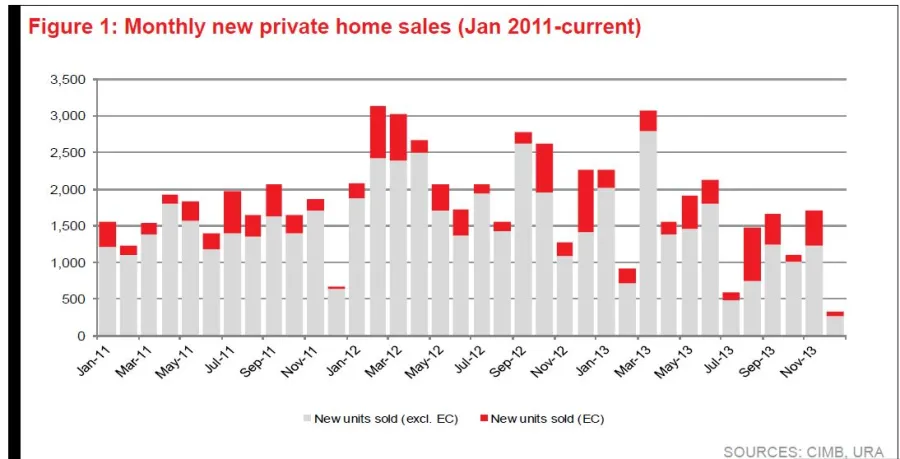 According to CIMB, while take-up was very low in Dec, new launches were lower. 2H13 new home sales declined over 50% from 1H13 since the implementation of TDSR.