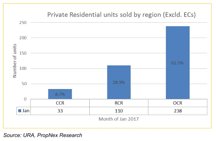 Developers saw an uptick in sales volume for the month of January, up 18.3% to 381 units sold. According to PropNex, properties in the Outside Central Region (OCR) was the most sought after in the said month, accounting for 62.5% of new private home sales with 238 units.