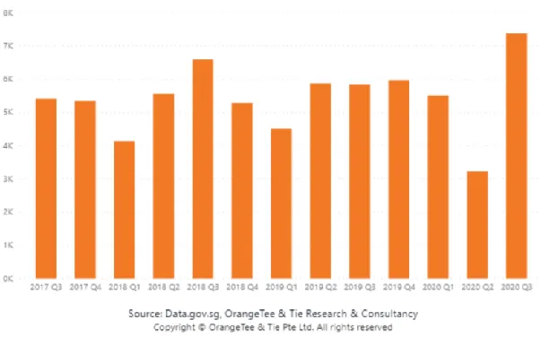 This chart from OrangeTee & Tie shows that 7,787 units were transacted in Q3 2020, 127.3% higher than the number of units transacted in the previous quarter.