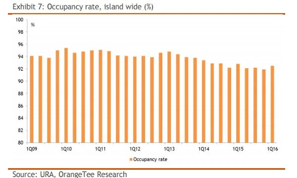 According to analysts from Orangetee Research, the uptick in occupancy from 91.9% in 4Q15 to 92.5% in 1Q16 can be attributed to a smaller number of completions in 1Q16, as only 2,855 private residential units were completed in 1Q16 as compared to 5,299 private residential units in 4Q15.