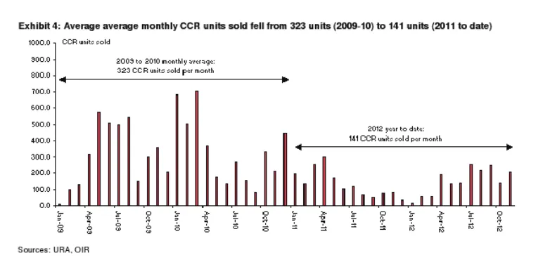 In the period over 2009-2010, OCBC reports that new home sales volume in the Core Central Region (CCR) averaged at 323 units per month; this fell to 141 units per month in the period from 2011 to date.