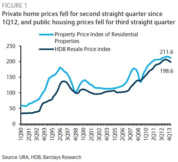 Barclays said that according to the Housing Development Board (HDB), public housing prices posted their third consecutive quarterly drop – the HDB resale price index fell 1.5% q/q and -3.4% y/y, after its 1.5% decline in 4Q13 and -0.9% in 3Q13, bringing the cumulative decline to 3.9% from the peak.