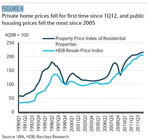 According to Barclays, private home prices have posted the first drop in seven quarters – the 4Q13 URA private home price index fell 0.8% q/q, bringing the full-year 2013 to a slight increase of +1.2%, which compares to increases of 2.8%/5.9%/17.6% in full-year 2012/2011/2010.