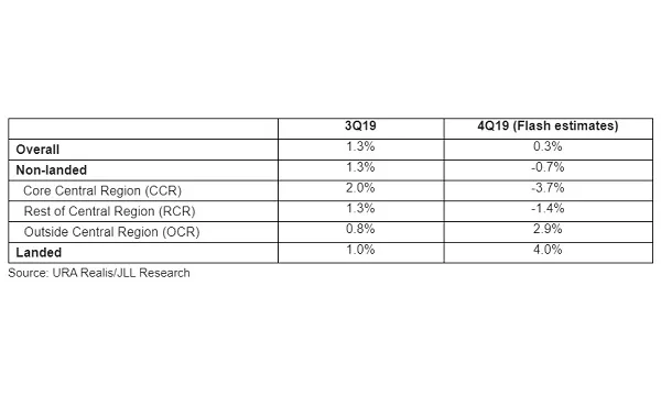 This chart from JLL Research showed that URA’s overall private residential property price index rose 0.3% in Q4 2019, moderating from the 1.3% increase in Q3. This was buoyed by a 4% growth in landed home prices.