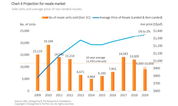 This chart from OrangeTee forecasts that the number of private resale transactions in Singapore could hit 9,000-10,000 units, marking a continued decline since 2017.