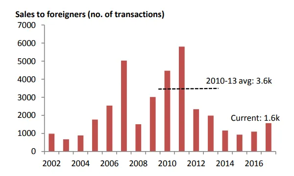 In terms of percentage of total transactions, only 5.6% of transactions in 2017 were attributed to foreigners against a long-term 18-year average of 8.7%.