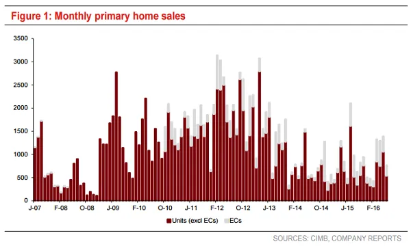 Home sales in June have slowed on back of a lack of new launches, according to a report by CIMB. In June 2016, home sales totaled 536 sans executive condos (768 with ECs), which is 43% YoY jump but a drop of 49% MoM.