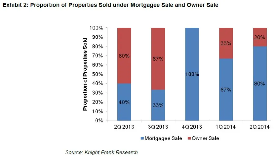 For type of sale, the proportion of properties put up under mortgagee sale has risen from 24 per cent in 1Q 2014 to 44 per cent in 2Q 2014. Similarly, on a yearly basis, this proportion has risen from 7 per cent in 1H 2013 to 33 per cent in 1H 2014.