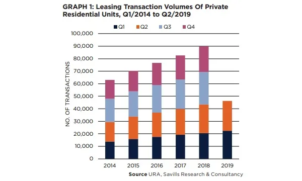 This chart from Savills shows that the rental market for private residential properties rose 7% YoY to a record 23,875 units in the second quarter, higher than the 22,317 leases recorded in Q2 2018.