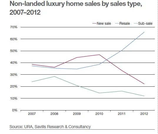 Demand for luxury homes, it said, has been lacklustre since the onset of the eurozone debt crisis and the imposition of the Additional Buyer’s Stamp Duty (ABSD) in December last year. With the additional 10% stamp duty on corporate entities and expatriates purchasing their fi rst private homes, the luxury market was the hardest hit as overseas buyers made up nearly 43% of all prime home sales last year.