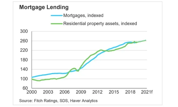 This chart from Fitch Ratings shows that mortgage lending is tipped to grow 2% in 2020 and 2021 after a projected decline of 0.5% in 2019.